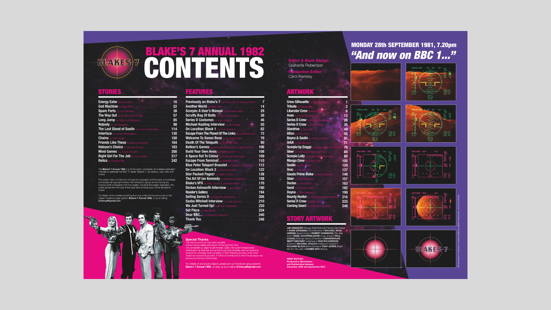 The Blake's 7 Annual 1982 began as a joke in December 2020. Posted on Twitter as a mock-up with the message "In an alternative universe there was a fourth Blake's 7 Annual." Response was immediate, and it was quickly clear that many shared the wish that the Annual existed. With the country in the midst of various lockdowns, myself and a friend decided to try and make it happen. A call-out for short stories and artwork resulted in a deluge of material. Production ran from December 2020 to September 2021. The quality of contributions from the fan community resulted in first ever official Cult Edge publication, and the response was overwhelmingly positive. This book serves as a testament to the love Blake's 7 still holds for many people, and the creativity of the fan community.