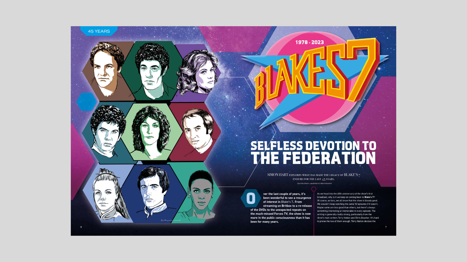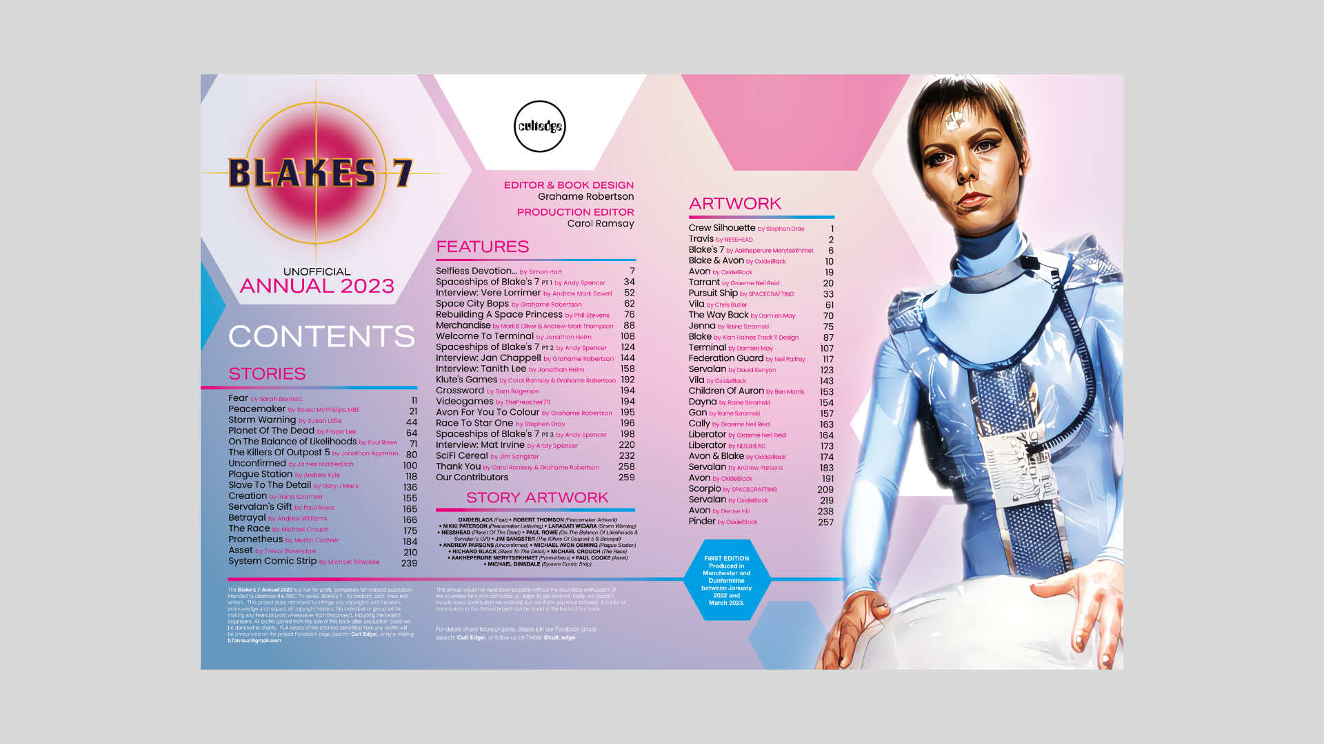 With the success of the Blake's 7 Annual 1982, planning for a 2023 Annual began immediately. A call out for submissions again resulted in an amazing influx of fan created artwork, short stories and articles. Production took place between January 2022 and March 2023. The cover illustration was created by celebrated illustrator and designer Robert Hammond, with a Contributor Edition cover illustration (below) by Aakheperure Merytsekhmet. This book features a brand new and extensive interview with Jan Chappell, who played Cally.