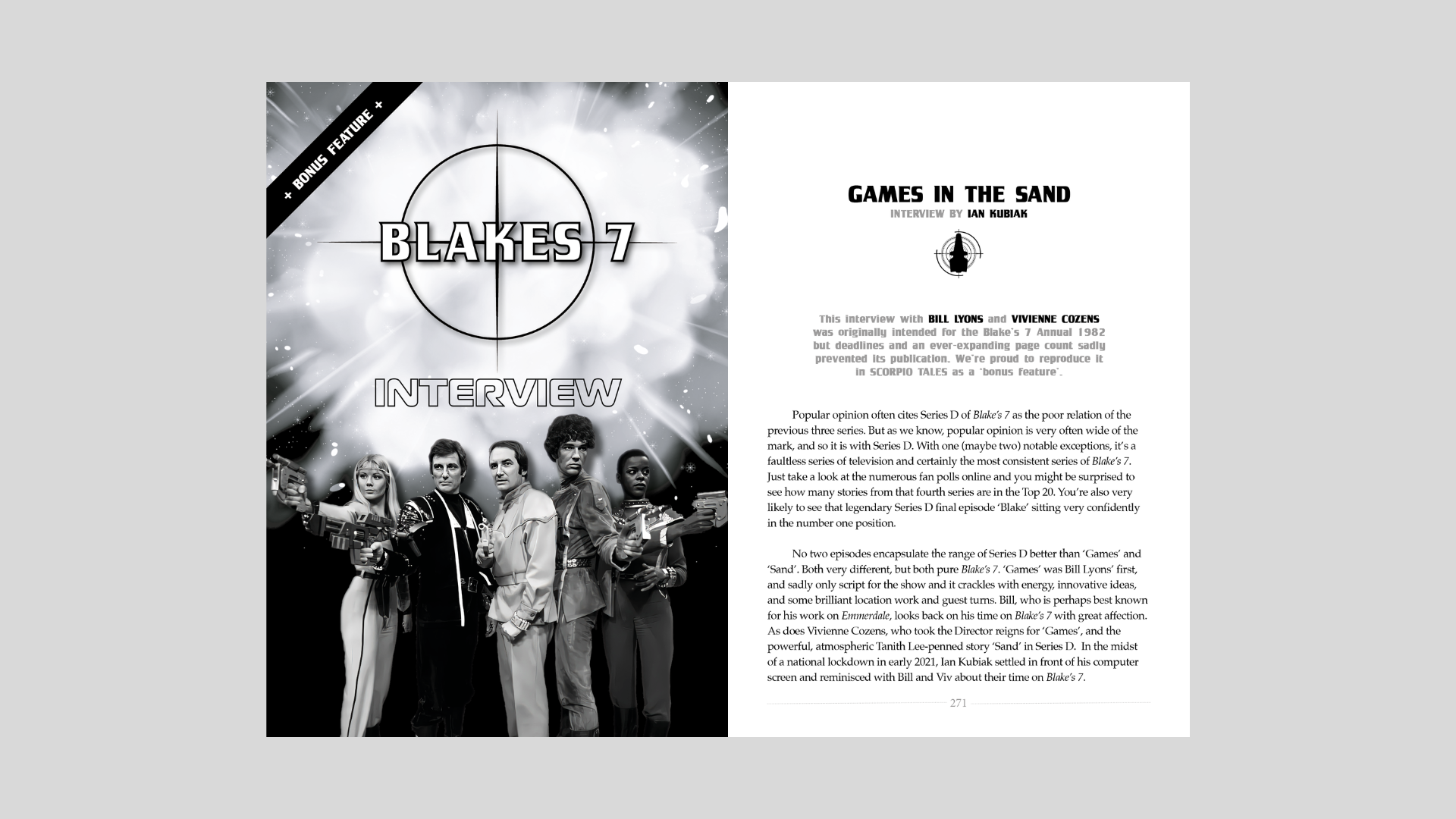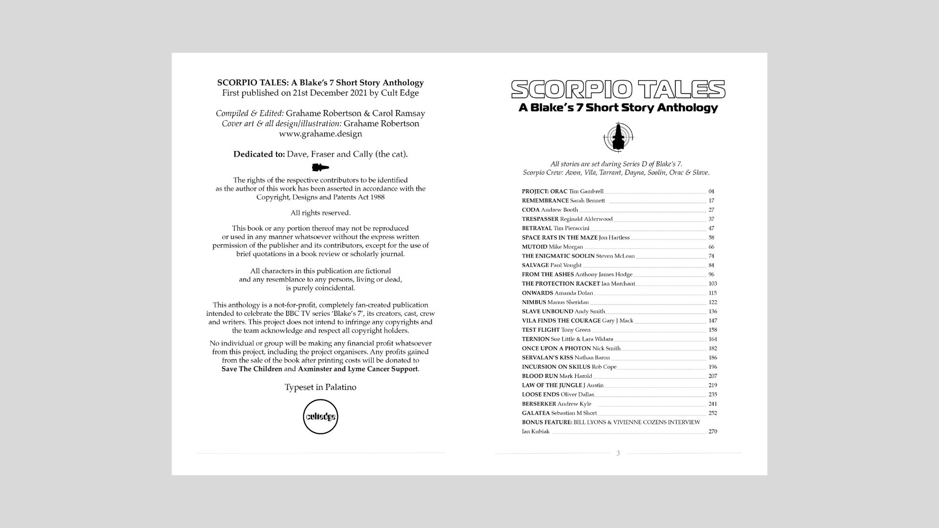 'Scorpio Tales' is a short-story anthology covering the fourth series (Series D) of Blake's 7. When we put out a call for story submissions for the 'Blake's 7 Annual 1982' we were inundated with entries. And they were all, without exception, excellent and worthy of publication. After the stories had been selected for the Annual, we couldn't bear the thought of shelving the other submissions. So, 'Scorpio Tales' was born as the perfect accompaniment to the Annual. Many of the stories are prefaced by an original illustration. This book also includes an interview with Bill Lyons and Vivienne Cozens, who both contributed scripts for Series D ('Games' and 'Sand'). This interview didn't quite make the cut for the 1982 Annual due to lack of space, and is presented here as a 'bonus feature.'